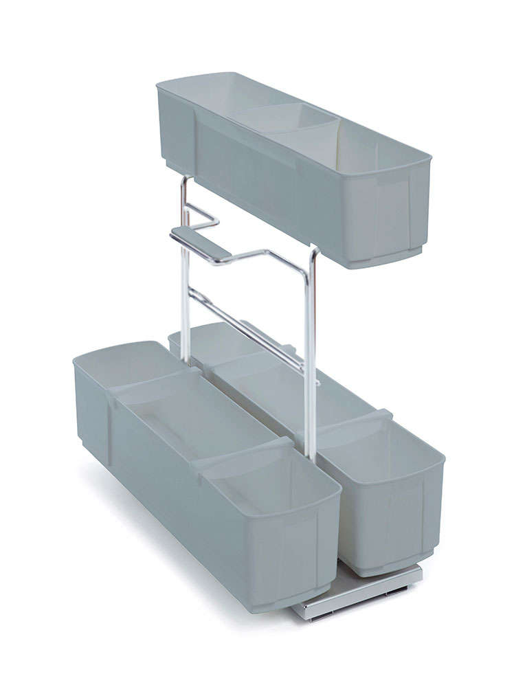 Выдвижной механизм с центральной рамой и регулируемыми полками для хранения различных средств для уборки дома. Функциональная боковая часть легко снимается и переносится в место уборки. Дно съемного модуля снабжено силиконовыми ножками, чтобы ставить его на любые поверхности, не повреждая их. Емкости Клининг Агента снабжены перемещаемыми делителями для надежной фиксации.