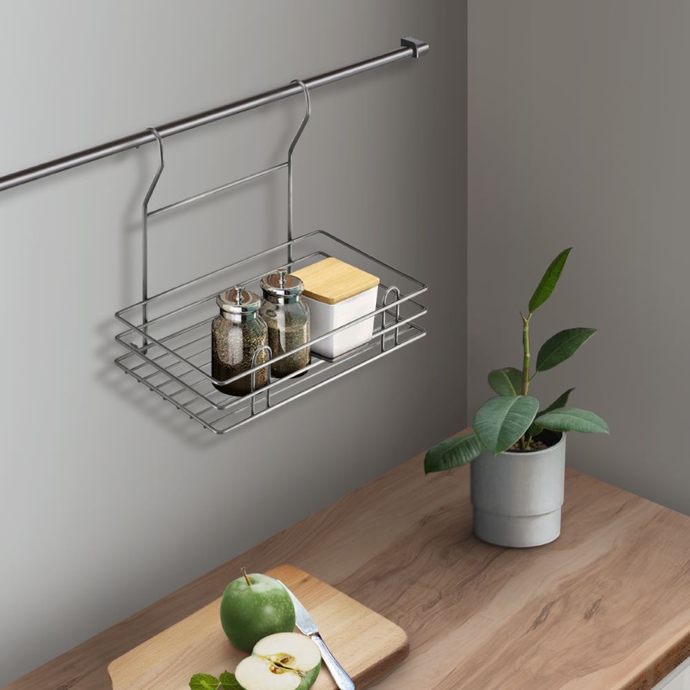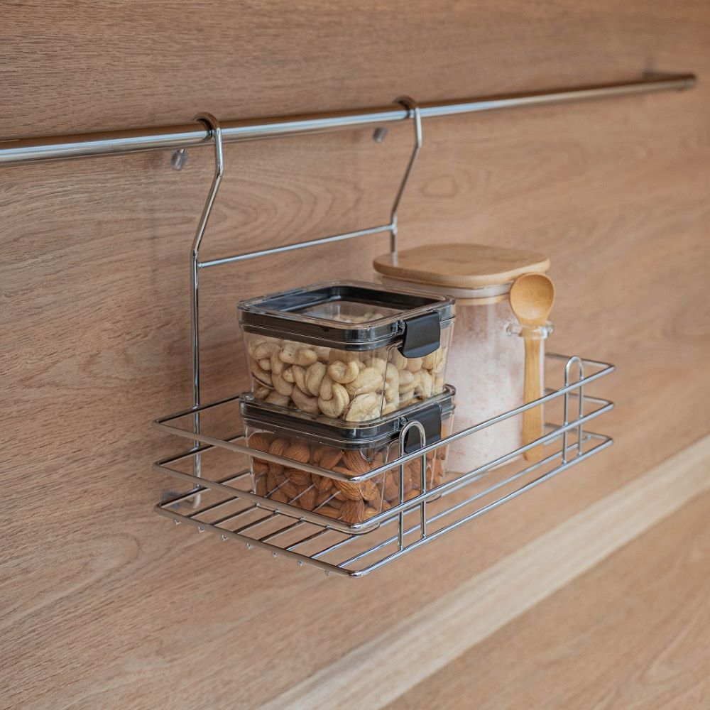 Полка позволяет эффективно использовать пространство на стене. Если повесить полку над мойкой, то на нее поместятся все моющие средства. Если разместить полку над рабочей зоной, то можно поставить на нее часто используемую технику. Например, кофемолку или миксер. Изготовлена из стали, надежно крепится на трубу рейлинга, прослужит долго.