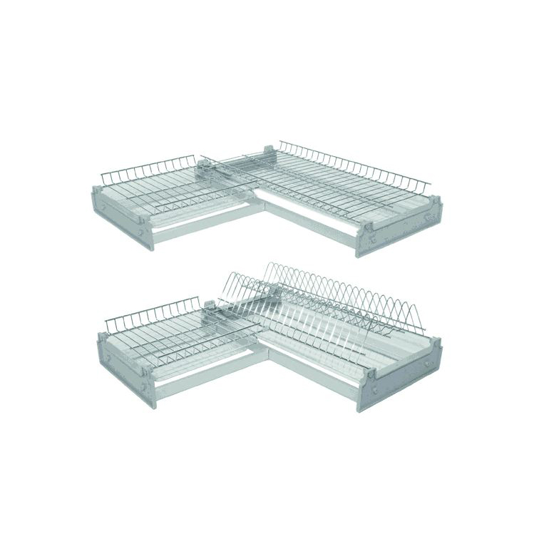 Надежная и вместительная сушка встраивается в угловой кухонный шкаф. Каждая полка оснащена пластиковым поддоном. Полки изготовлены из хромированной стали.