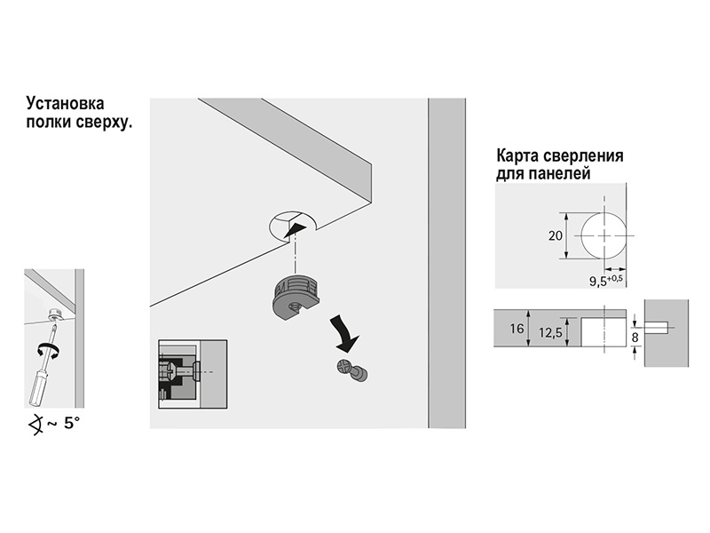 Стяжка-эксцентрик Hettich VB 35M/16 и VB 35V/16 представляет собой надежное решение для крепления полок и других элементов мебели. Она позволяет комфортно затягивать стяжку отверткой под углом 25 градусов к оси корпуса, что облегчает монтаж в труднодоступных местах. Специальная конструкция эксцентрика хеттих обеспечивает доступ для затягивания сверху через сквозное отверстие диаметром 10 мм, что удобно для нижних полок с ограниченным доступом снизу. Это позволяет избежать ослабления соединения даже при повторном затягивании, благодаря большому пути затягивания и компенсации допусков. В качестве ответной части используются саморезные штоки DU 321 и DU 322 Hettich.